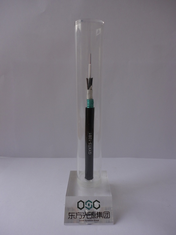 此結(jié)構(gòu)光纜是由1根PBT松套管置于纜中心,外繞絞12根磷化鋼絲,鋼絲間填充阻水纜膏,并繞包無紡布及縱包雙面涂覆皺紋鋼【鋁】塑復(fù)合帶,最后擠中密度聚乙烯護(hù)套。松套管是由溫度特性好的材料擠成,管中放入具有合適余長的多根(2-12芯)單?;蚨嗄9饫w,并填充防潮光纖用油膏。